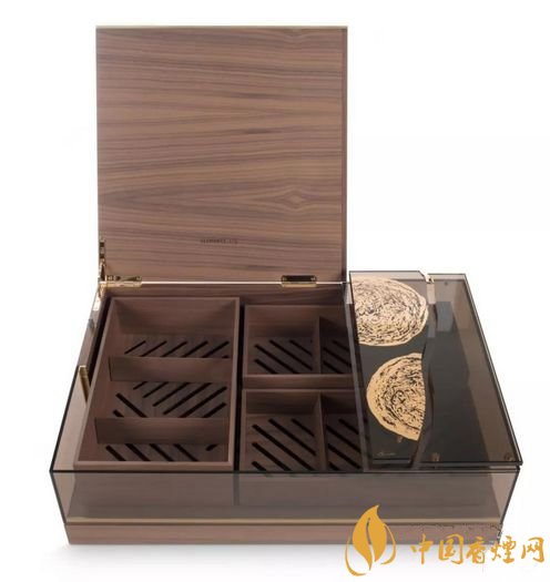 保濕盒還帶有圓形的雪茄紋路圖案,這個(gè)圖案是漢娜在瑞士日內(nèi)瓦大衛(wèi)杜夫的旗艦店抽的第一支雪茄的復(fù)刻品,將其進(jìn)行保存和渲染在24k金浮雕玻璃和鍍金黃銅上。她指出,正是她對(duì)手卷雪茄的迷戀,讓她將這種情感反映在這款保濕盒上。