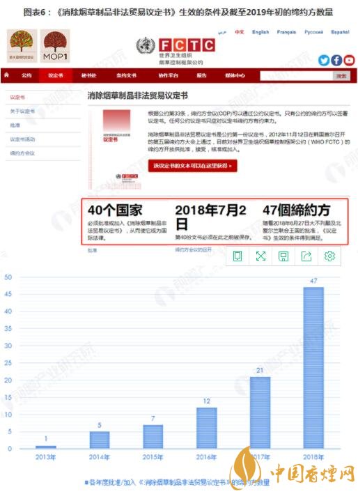 世界衛(wèi)生組織還積極推動(dòng)《消除煙草制品非法貿(mào)易議定書》簽訂生效。按照2012年通過(guò)該議定書時(shí)的約定,《議定書》需要40個(gè)締約方可生效,《議定書》將在第40份文書被保存后第90天起生效。根據(jù)世界衛(wèi)生組織煙草控制框架公約發(fā)布的情況,隨著2018年6月27日大不列顛及北愛爾蘭聯(lián)合王國(guó)的批準(zhǔn),《議定書》生效的條件得到滿足。目前,議定書締約方數(shù)量已經(jīng)達(dá)到47個(gè)。