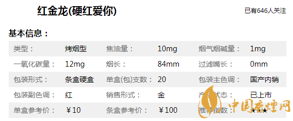 紅金龍(愛你)是武煙旗下重點品牌紅金龍卷煙2014年底新推出的卷煙系列,有紅金龍(硬愛你)、紅金龍(愛你)硬藍幾種規(guī)格。在擠壓式競爭的當下,紅金龍(硬藍愛你)的脫穎而出絕非巧合。它是企業(yè)對品牌發(fā)展用心,對市場競爭走心,對產(chǎn)品創(chuàng)新用心的結果。紅金龍硬(藍紅)愛你多少錢一條?下面香煙網(wǎng)小編為大家整理介紹。