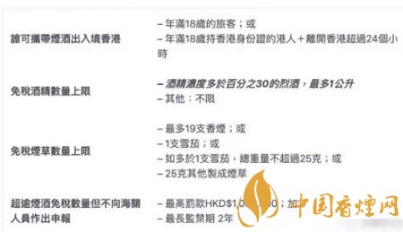 港海關(guān)規(guī)定,每個(gè)人最多可以攜帶19只香煙。超過規(guī)定數(shù)量,需要申報(bào)并且上稅。香港法律規(guī)定未申報(bào)超額香煙最高可判處監(jiān)禁2年、罰款100萬港幣。