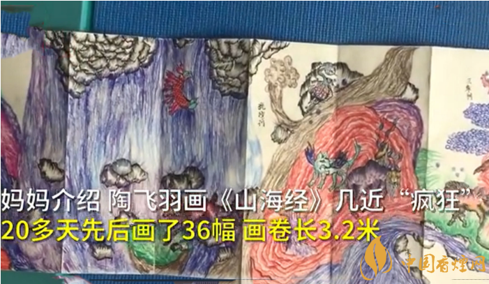 重慶10歲的陶飛羽暑期萌發(fā)了繪畫《山海經(jīng)》故事的想法。媽媽介紹,陶飛羽畫《山海經(jīng)》幾近“瘋狂”,20多天先后畫了36幅,畫卷長3.2米。除了畫《山海經(jīng)》的奇花異獸和奇特風(fēng)貌,陶飛羽還嘗試?yán)L神話故事。