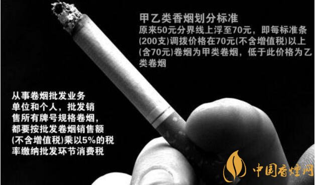 甲類(lèi)卷煙(調(diào)撥價(jià)70元或以上/條):稅率56%,另收0.003元/支,于生產(chǎn)環(huán)節(jié)征收;乙類(lèi)卷煙(調(diào)撥價(jià)低于70元/條):稅率36%,另收0.003元/支,于生產(chǎn)環(huán)節(jié)征收;