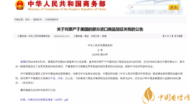 隨著中美貿(mào)易戰(zhàn)的不斷升級(jí),從受限清單的第一頁,煙民們酒看到了煙草生產(chǎn)過程中涉及的未去梗烤煙、其他去梗煙草、煙草制的雪茄煙、煙草制的卷煙等產(chǎn)品。為捍衛(wèi)中方自身合法權(quán)益,中國政府依據(jù)《中華人民共和國對(duì)外貿(mào)易法》等法律法規(guī)和國際法基本原則,對(duì)原產(chǎn)于美國的進(jìn)口商品對(duì)等采取加征關(guān)稅措施,稅率為25%,涉及2017年中國自美國進(jìn)口金額約500億美元。