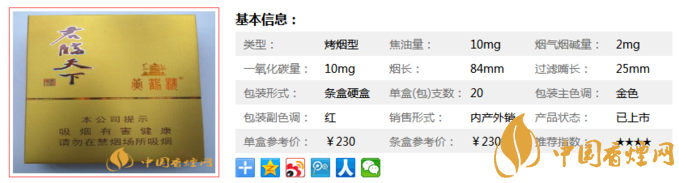 黃鶴樓君臨天下,嚴(yán)格選用優(yōu)質(zhì)煙葉,配以天然香精香料,本香清晰,工序把控精細(xì),煙氣充實(shí)感十足。開始抽的第一口,煙的口感是綿柔繚繞,第二口的時(shí)候煙勁就來(lái)了,醇厚煙氣在口中回味生津。下面就隨香煙網(wǎng)的小編來(lái)仔細(xì)了解,關(guān)于黃鶴樓君臨天下的價(jià)格及其詳細(xì)參數(shù)。