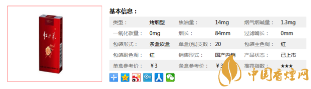 類型 :烤煙型 焦油量 :14mg 煙氣煙堿量 :1.3mg 一氧化碳量 :12mg