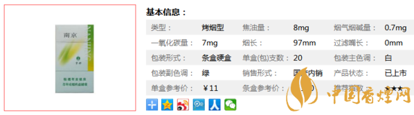 類型 :烤煙型 焦油量 :8mg 煙氣煙堿量 :0.7mg 一氧化碳量 :7mg