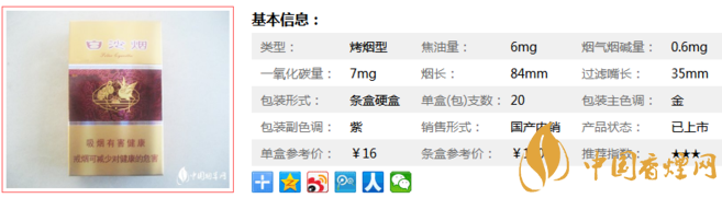 類型 :烤煙型 焦油量 :6mg 煙氣煙堿量 :0.6mg 一氧化碳量 :7mg