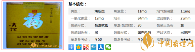 貴煙天下第一福雖然已經(jīng)停產(chǎn),但是知名度還是很大的,下面我們一起來看看它的參數(shù)信息。煙長84mm,焦油量11mg,煙堿量1.1mg,一氧化碳量12mg,貴煙特色工藝精工制作,原料保障精挑細(xì)選,產(chǎn)品質(zhì)量嚴(yán)格把關(guān)。