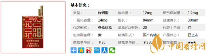 | 類(lèi)型 :烤煙型 | 焦油量 :12mg | 煙氣煙堿量 :1.2mg | 一氧化碳量 :14mg |