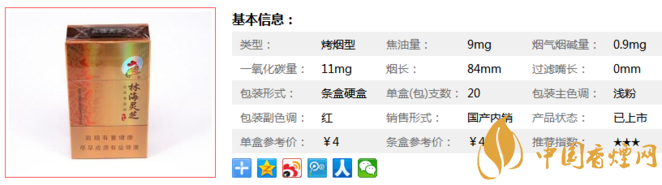 類型 :烤煙型 焦油量 :9mg 煙氣煙堿量 :0.9mg 一氧化碳量 :11mg