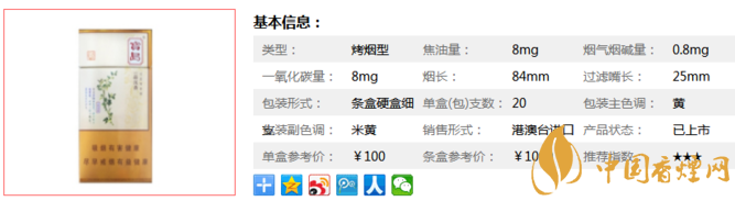 類型 :烤煙型 焦油量 :8mg 煙氣煙堿量 :0.8mg 一氧化碳量 :8mg