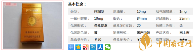 “江山”牌低危害卷煙由于采用不斷完善的中草藥提取液,每支煙中含有0.5%的“仙芪補(bǔ)腎顆粒”新型料液,除了低害特征外,最大的成功是理想地解決了低危害卷煙中的幾個(gè)常見(jiàn)問(wèn)題,如卷煙品質(zhì)至上、煙藥協(xié)調(diào)、口感余味、有效成分轉(zhuǎn)移等。下面我們一起來(lái)看江山一統(tǒng)香煙的參數(shù)信息:焦油量:10mg 煙堿量:1mg 一氧化碳量:10mg