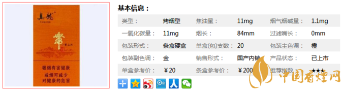 類型 :烤煙型 焦油量 :11mg 煙氣煙堿量 :1.1mg 一氧化碳量 :11mg
