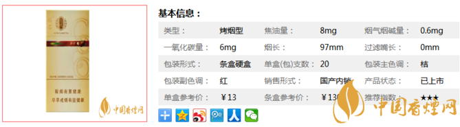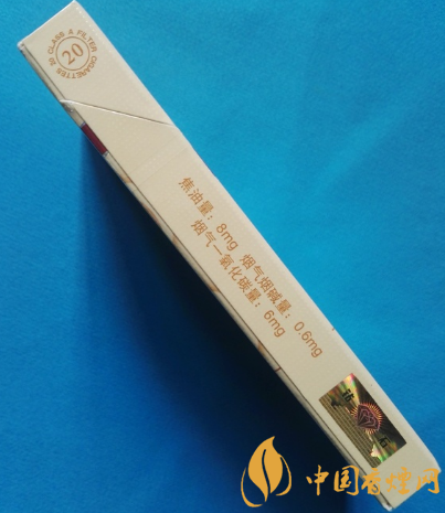 類型 :烤煙型 焦油量 :8mg 煙氣煙堿量 :0.6mg 一氧化碳量 :6mg