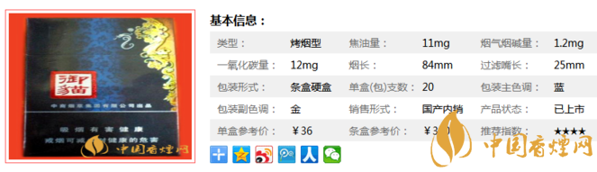 這款煙整體采用藍色為主調,邊上點綴金色花邊,里面煙支也是藍色,看上去很有點檔次的。定價有點高,但是盒子真心好看,偶爾買來一包用來收藏還是非常不錯的選擇。經(jīng)香煙網(wǎng)小編市場調查御貓藍售價為36元/包。