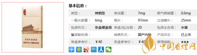 | 類型 :烤煙型 | 焦油量 :7mg | 煙氣煙堿量 :0.6mg | 一氧化碳量 :6mg |