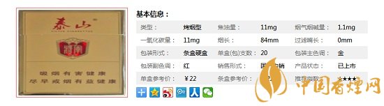 類型 :烤煙型 焦油量 :11mg 煙氣煙堿量 :1.1mg 一氧化碳量 :11mg