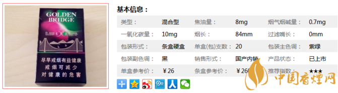 金橋雙爆香煙包裝上增加了立體暗紋,顯得非常有檔次,象征雙爆的紅綠顏色過(guò)渡設(shè)計(jì)的也非常漂亮,總之個(gè)人非常喜歡,目前還是全球限量。作為雙爆珠香煙,這款煙的定價(jià)已經(jīng)是低價(jià)親民了!經(jīng)香煙網(wǎng)小編市場(chǎng)調(diào)查金橋雙爆售價(jià)為26元/包。