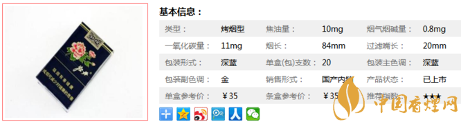 牡丹軟藍(lán),煙支長(zhǎng)84mm,過(guò)濾嘴長(zhǎng)20mm,軟包包裝首創(chuàng)運(yùn)用絨面印刷工藝,更具質(zhì)感,更顯優(yōu)雅,并將花型悉心勾勒,同時(shí)增加的金線,在一抹懷舊藍(lán)的映襯下精致感倍增。下面我們一起來(lái)看牡丹軟藍(lán)的參數(shù)信息:焦油量:10mg. 煙堿量:0.8mg. 一氧化碳量:11mg.