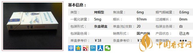 類型 :烤煙型 焦油量 :6mg 煙氣煙堿量 :0.6mg 一氧化碳量 :5mg