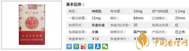 類(lèi)型 :烤煙型 焦油量 :10mg 煙氣煙堿量 :1.1mg 一氧化碳量 :11mg