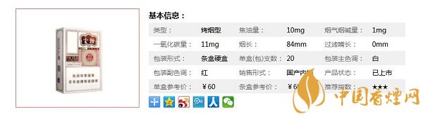 | 煙長(zhǎng):84mm | 過(guò)濾嘴長(zhǎng):25mm | 包裝形式:條盒硬盒 | 單盒(包)支數(shù):20 |