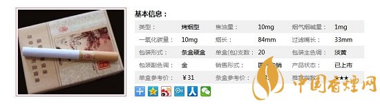 類型 :烤煙型 焦油量 :10mg 煙氣煙堿量 :1mg 一氧化碳量 :10mg