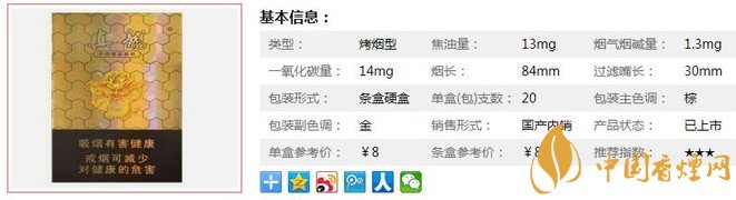 | 類型 :烤煙型 | 焦油量 :13mg | 煙氣煙堿量 :1.3mg | 一氧化碳量 :14mg |