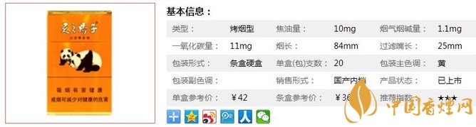 類型 :烤煙型 焦油量 :10mg 煙氣煙堿量 :1.1mg 一氧化碳量 :11mg