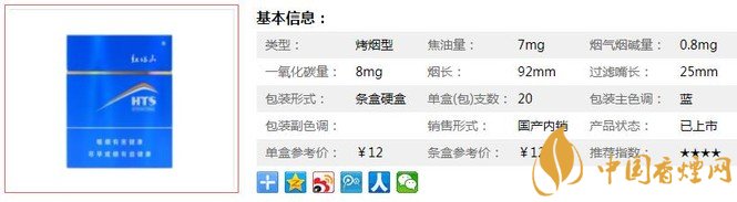 類型 :烤煙型 焦油量 :7mg 煙氣煙堿量 :0.8mg 一氧化碳量 :8mg