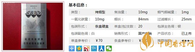 類型 :烤煙型 焦油量 :10mg 煙氣煙堿量 :1mg 一氧化碳量 :10mg
