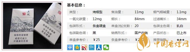 | 類(lèi)型 :烤煙型 | 焦油量 :11mg | 煙氣煙堿量 :1.1mg | 一氧化碳量 :12mg |