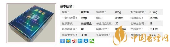 類(lèi)型 :烤煙型 焦油量 :8mg 煙氣煙堿量 :0.8mg 一氧化碳量 :9mg