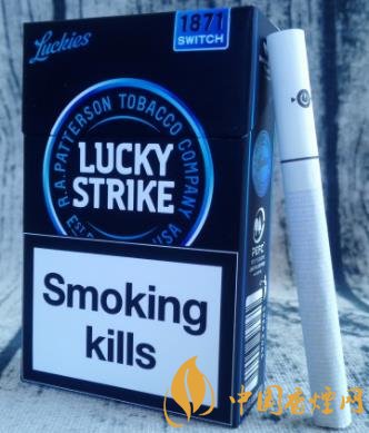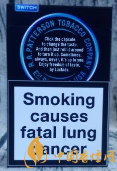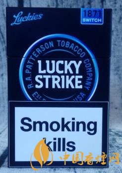 藍(lán)色,本就屬于神秘的色調(diào)。二者結(jié)合起來,帶來的視覺感,無疑更加強(qiáng)烈。撫摸煙盒的六面體,觀賞著黑藍(lán)相融的色調(diào),不失為一種雅趣。圓圈中的LUCKY  STRIKE,撫摸起來凹凸感很明顯。翻蓋處1871下方的SWITCH,意為“轉(zhuǎn)變、轉(zhuǎn)換”,也就是指因?yàn)檫^濾嘴內(nèi)置爆珠,從而改變煙的味道。這款歐盟版的煙盒正面上方,沒有印制CLICK(捏破)字樣及爆珠標(biāo)識(shí),煙盒底部和內(nèi)襯錫紙上則有印制。