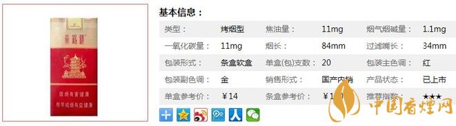 | 類(lèi)型 :烤煙型 | 焦油量 :11mg | 煙氣煙堿量 :1.1mg | 一氧化碳量 :11mg |