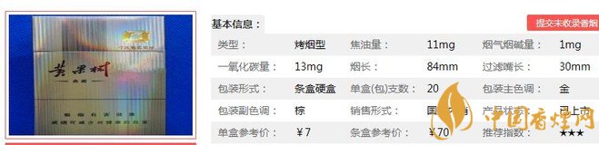 | 煙長:84mm | 過濾嘴長:30mm | 包裝形式:條盒硬盒 | 單盒(包)支數(shù):20 |