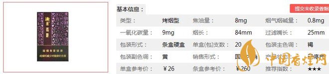 | 類型 :烤煙型 | 焦油量 :8mg | 煙氣煙堿量 :0.8mg | 一氧化碳量 :9mg |