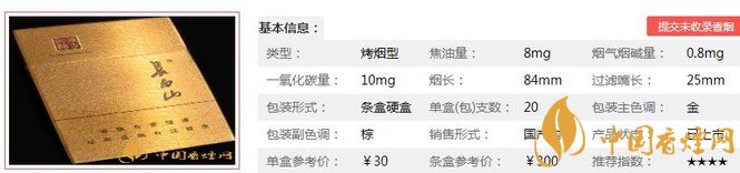 類(lèi)型 :烤煙型 焦油量 :8mg 煙氣煙堿量 :0.8mg 一氧化碳量 :10mg