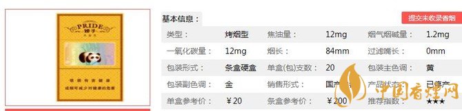 類型 :烤煙型 焦油量 :12mg 煙氣煙堿量 :1.2mg 一氧化碳量 :12mg
