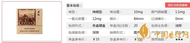 類型 :烤煙型 焦油量 :10mg 煙氣煙堿量 :1.1mg 一氧化碳量 :12mg