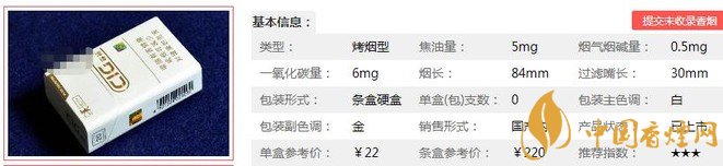 | 類型 :烤煙型 | 焦油量 :5mg | 煙氣煙堿量 :0.5mg | 一氧化碳量 :6mg |