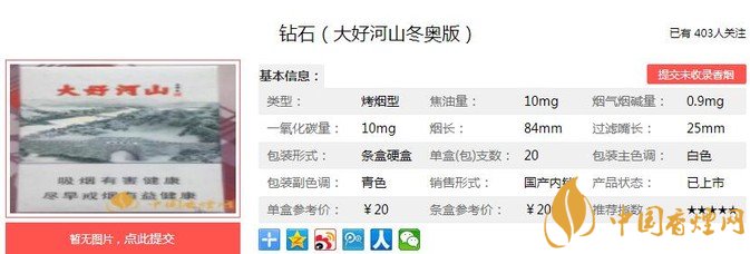 以上便是由香煙網(wǎng)小編為大家介紹的關(guān)于鉆石大好河山冬奧版價格及參數(shù) 獨(dú)家口感分析的相關(guān)信息,想要了解更多有關(guān)內(nèi)容請點(diǎn)擊:全球十大女士香煙品牌排行榜 精心整理全新首發(fā)