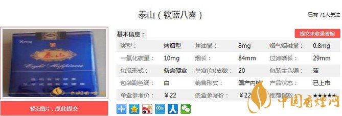 以上便是由香煙網(wǎng)小編為大家介紹的關(guān)于 泰山軟藍(lán)八喜價(jià)格和參數(shù) 泰山軟藍(lán)八喜口感分析的相關(guān)信息,想要了解更多有關(guān)內(nèi)容請(qǐng)點(diǎn)擊:雙喜國(guó)喜軟藍(lán)口感測(cè)評(píng) 清爽醇雅甜潤(rùn)怡然