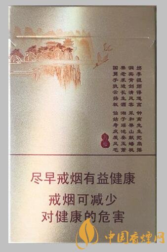 煙盒正面翻蓋處的八仙過海四字的設(shè)計,有些與金圣的滕王閣相似。主圖為騰云駕霧的老哥八個,應該屬于線條畫的類型。警示語句為最新版本。整體為三段,最上段為燙金畫面,顏色與最下面部位相同。煙盒背面采用七言律詩的格式,簡介了八仙各自的特點。整體包裝十分有神韻。