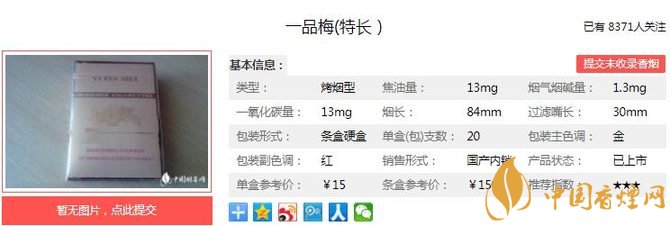 商標主色調(diào)為金色,富麗堂皇,氣派尊貴; 香氣濃馥、悠長,煙氣豐滿細膩,層次感強,余味干凈舒適,口感純正,入喉舒適和順; 30mm超長濾嘴,有效降低煙氣中焦油、一氧化碳等有害物質(zhì)。經(jīng)香煙網(wǎng)小編市場調(diào)查一品梅特長售價為15元/包。
