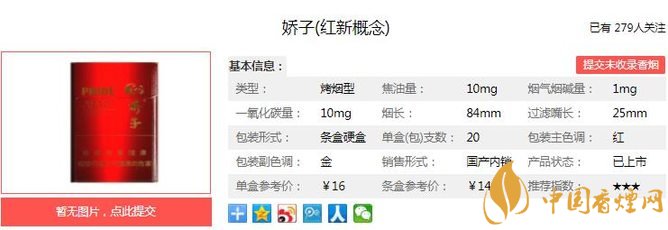 嬌子紅新概念煙支長84mm,過濾嘴長25mm,該產(chǎn)品在運用傳統(tǒng)的葉組配方降焦技術(shù)和卷煙紙降焦技術(shù)的基礎(chǔ)上,成功地集成應(yīng)用了復(fù)合生化制劑減害材料這項具有川渝公司自主知識產(chǎn)權(quán)的核心減害技術(shù)。下面我們一起來看嬌子紅新概念的參數(shù)信息:焦油量:10mg 煙堿量:1.0mg 一氧化碳量:10mg