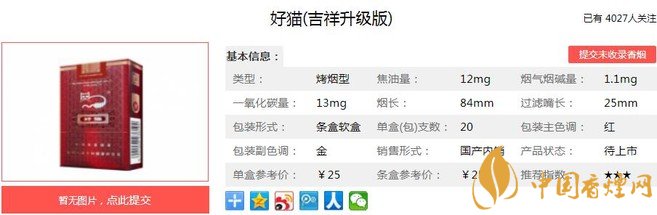 好貓吉祥升級版煙支長84mm,過濾嘴長25mm,添加中草藥提取物“豐和液”,在保留煙草本香的同時有效降低主流煙氣中的各項有害物質(zhì)指標(biāo),提高卷煙的吸食安全性。下面我們一起來看好貓吉祥升級版的參數(shù)信息:焦油量:11mg 煙堿量:1.1mg 一氧化碳量:13mg