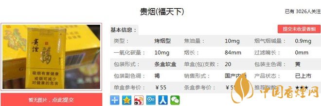 貴煙福天下在追求香氣細(xì)膩柔和基礎(chǔ)上,保證一定的口腔充盈性和濃度,表現(xiàn)出煙草本香明顯并透發(fā)出特色果香香氣。刺激性較低,協(xié)調(diào),整只煙透發(fā)出果香、辛香、奶香、烤香、蜜甜香的香氣特征,使產(chǎn)品在抽吸時(shí)令人感受到愉悅舒適的享受。經(jīng)香煙網(wǎng)小編市場(chǎng)調(diào)查貴煙福天下售價(jià)為55元/包。