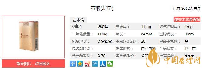 蘇煙(新星)和蘇煙(天星)是“蘇煙”全新推出的“星系列”的兩個原創(chuàng)型產(chǎn)品;這兩款“星系列”的主力規(guī)格共同承載“蘇煙”通過主銷價區(qū)向上延伸力爭實現(xiàn)提升品牌價值的戰(zhàn)略意義,并以此來鞏固和提升“蘇煙”在高端消費者心目中所具有的“高端身份”的價值認(rèn)知。經(jīng)香煙網(wǎng)小編市場調(diào)查蘇煙新星售價為70元/包。