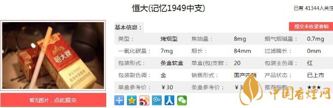 恒大(記憶1949)雖然是老牌包裝,但是不管是顏色還是款式都是比較不錯的。非常純正的煙草原始?xì)馕?,加上煙氣的較為順暢度,綜合的滿足感,還算是可以的。煙草的原味釋放得充分,綜合來說是一款比較值得推薦的香煙。下面就跟著香煙網(wǎng)小編一起來看看恒大(記憶1949)具體的詳情吧。